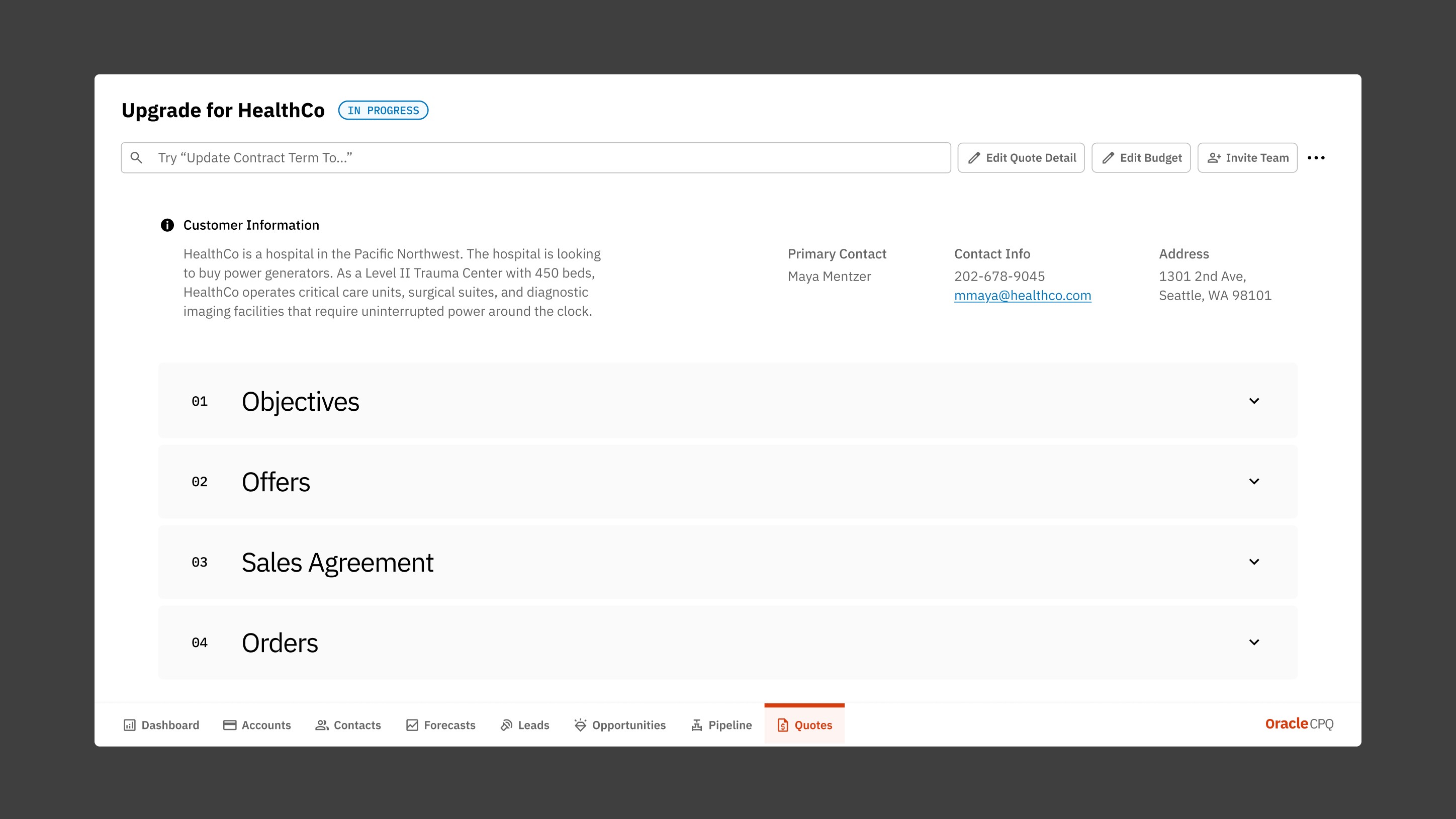 Oracle Configure, Price, Quote (CPQ) is a cloud-based software that allows sales teams to navigate massive product catalogs, build custom product configurations, and create quotes that meet their customers’ needs and budget.