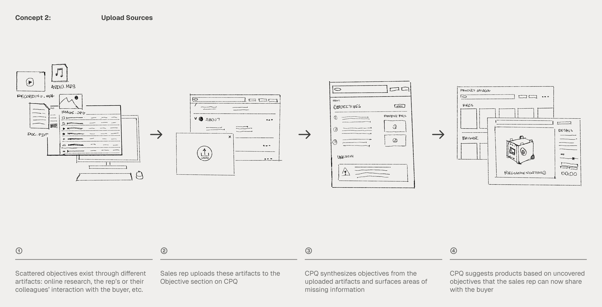 Two concepts emerged from brainstorming: ‘On-Call Guidance,’ an AI assistant that listens live during buyer calls and ‘Upload Sources,’ a CPQ feature which lets reps synthesize objectives from any artifact.