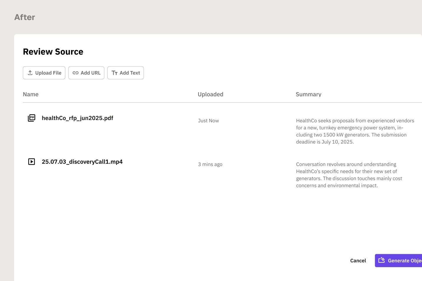 New objectives section allows reps to consolidates RFPs, call recordings, and meeting notes into a single knowledge hub, painting a holistic picture of what the customer actually needs.
