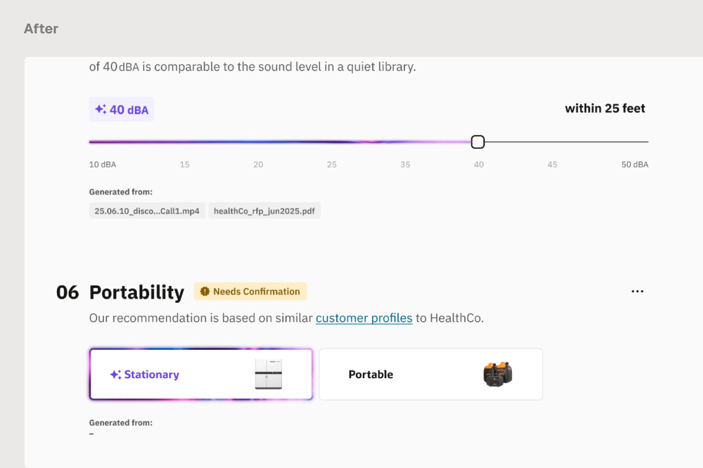 Instead of a static text summary, each objective is rendered as an interactive widget matched to its data type. Reps can validate AI suggestions at a glance and override them directly.
