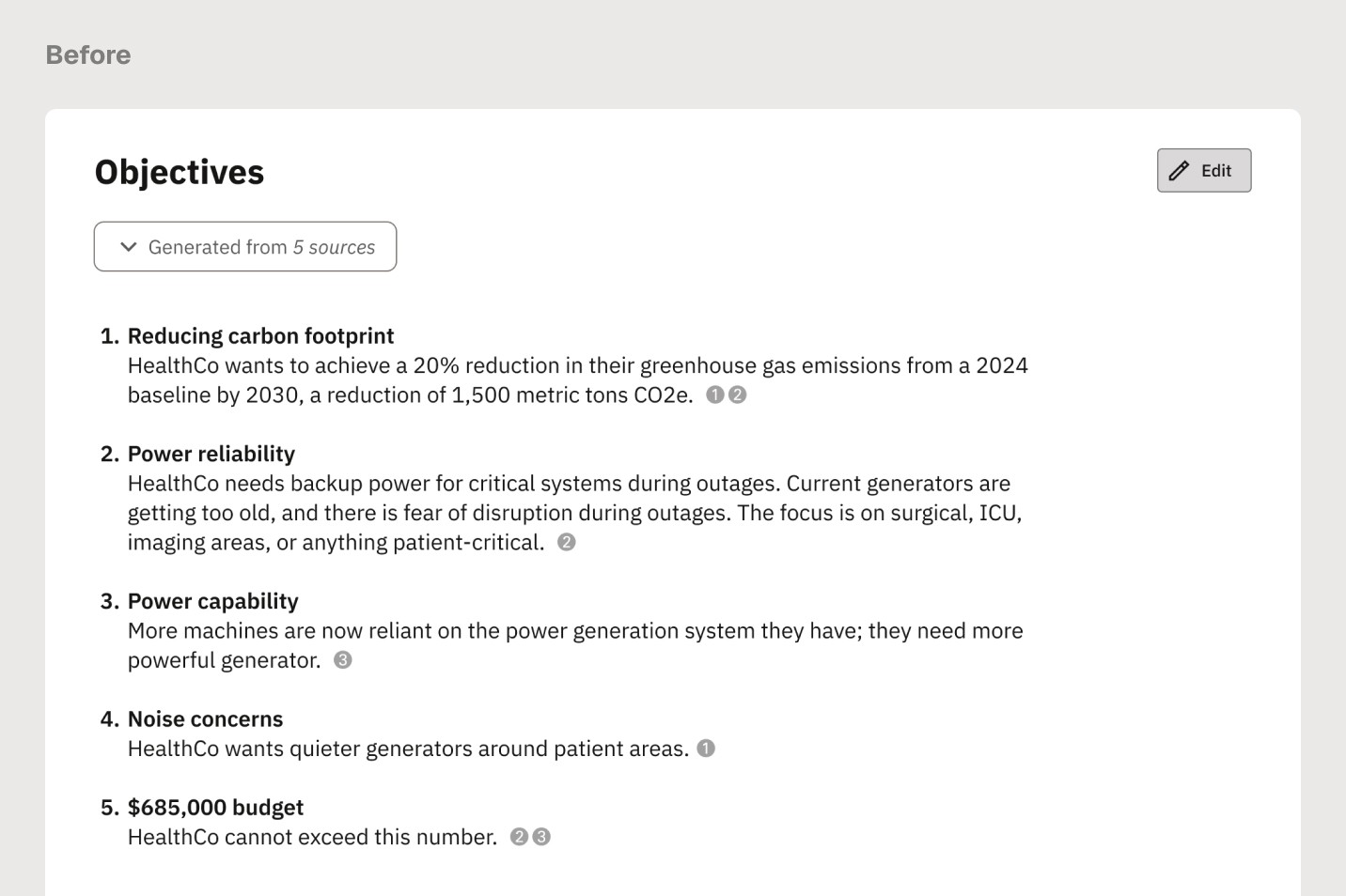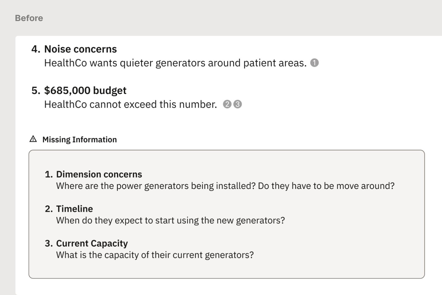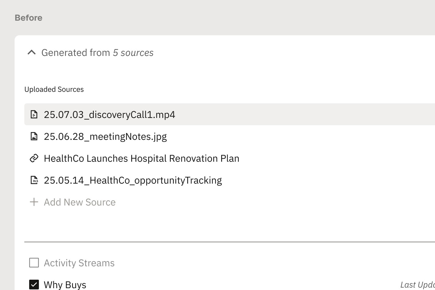 In the Earlier versions there’s no way way to check what the AI actually read. The final design shows a summary of each source, so reps can confirm relevance before anything gets generated.